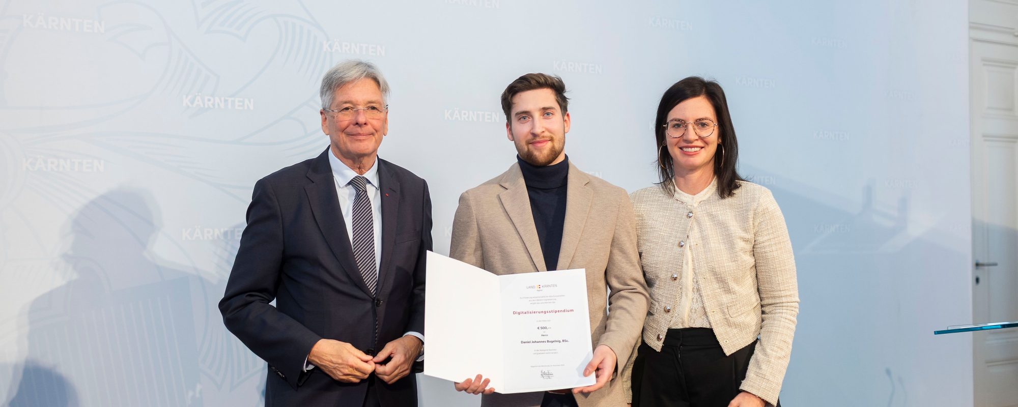 Our student assistant Daniel Bugelnig received the Digitalisierungsstipendium of the state of Carinthia for his Bachelor thesis entitled “Autonomous Drone System for Dynamic 3D-Object Reconstruction” on November 24, 2025. The Bachelor thesis was conducted in collobortion with the i2CAT research center in Barcelona and co-supervised by Filip Lemic, Prof. Perez and Prof. Rinner.